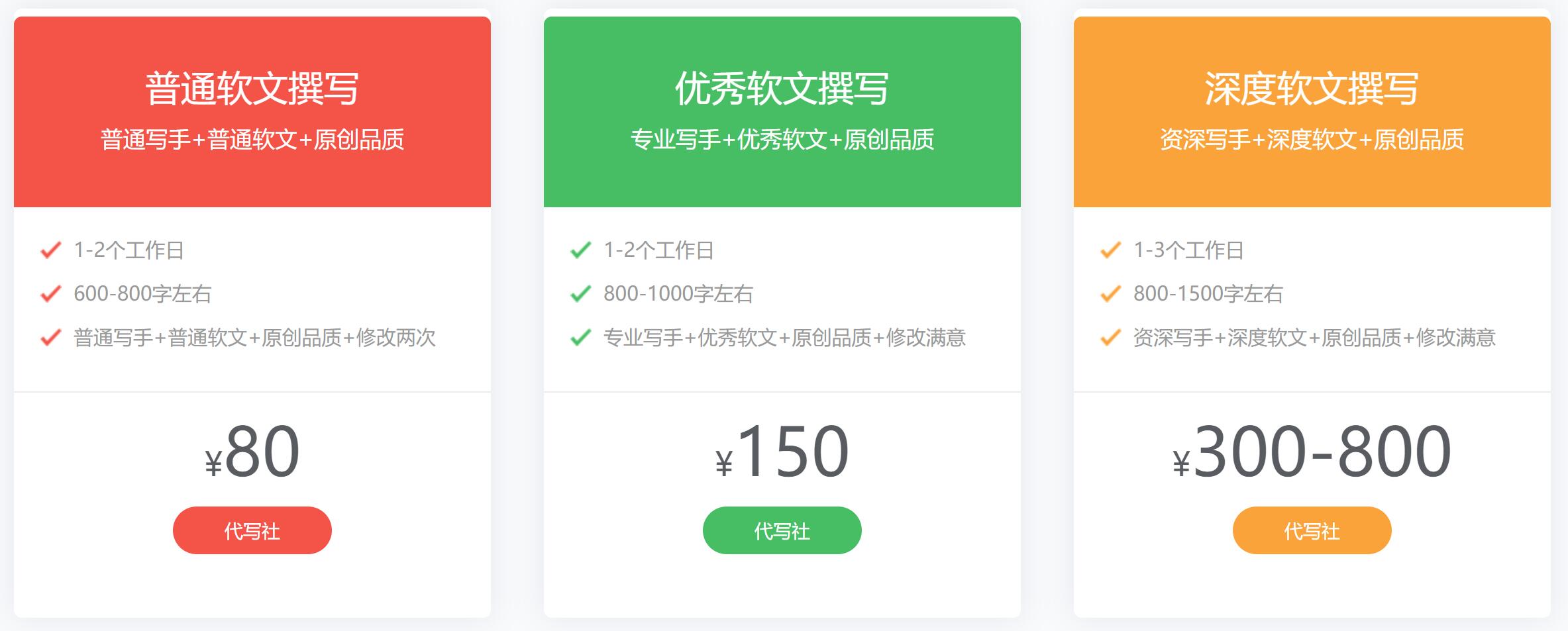 代写社文章代写费用报价: 代写社文章代写服务分不同的档次,档次不同提供的服务也不同。以下价格为初步报价,由于文章是定制型产品,需要您把详细需求提交给我们以后才能给出最终价格,可联系客服咨询详细报价。 代写社代写服务价格 三大保障为您服务