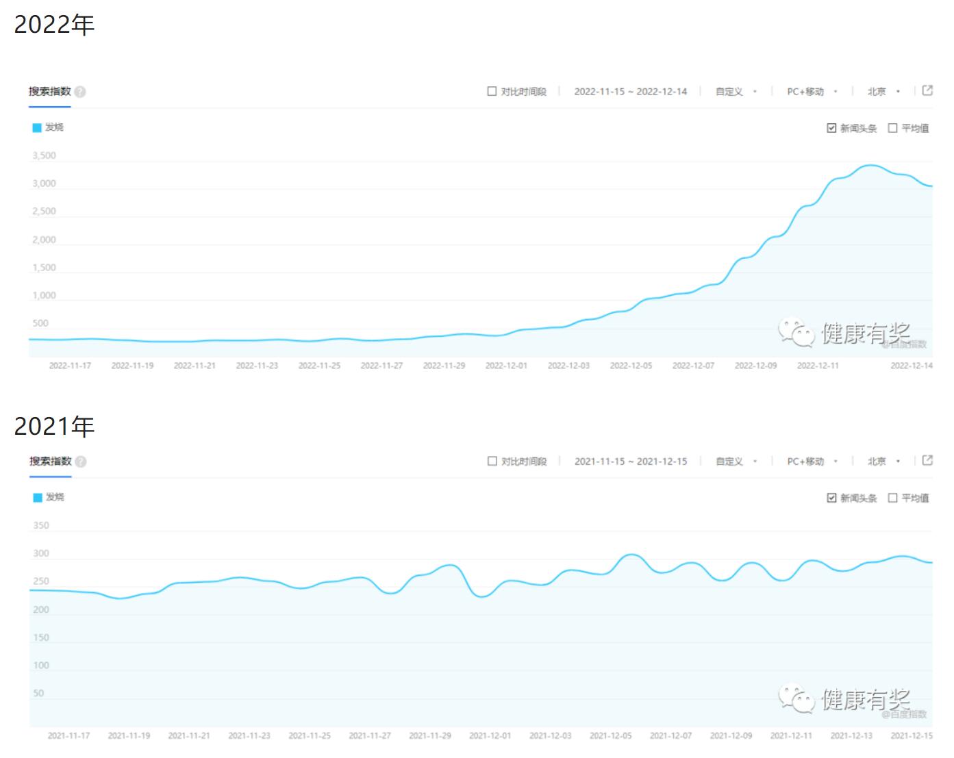 下面以发烧 作为关键字,分析2021年、2022年同期发烧这个关键词的搜索热度变化趋势,管中窥豹,一睹可能的疫情发展趋势。(以近30天数据作为参考,即2022年11月15日至12月14日,2021年同期对比时段为2021年11月15日至12月14日)